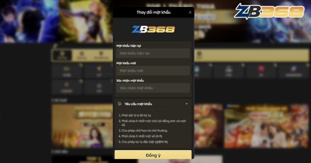 ZB368 khuyến khích đổi mật khẩu mỗi 30 ngày để tăng cường bảo mật. Khi đổi, hãy đảm bảo: